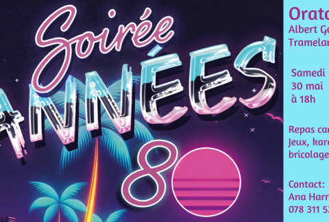 Une soirée conviviale le samedi 30 mai à 18h sur le thème des années 80: repas canadien, jeux, Karaoké et bricolages pour les enfants.