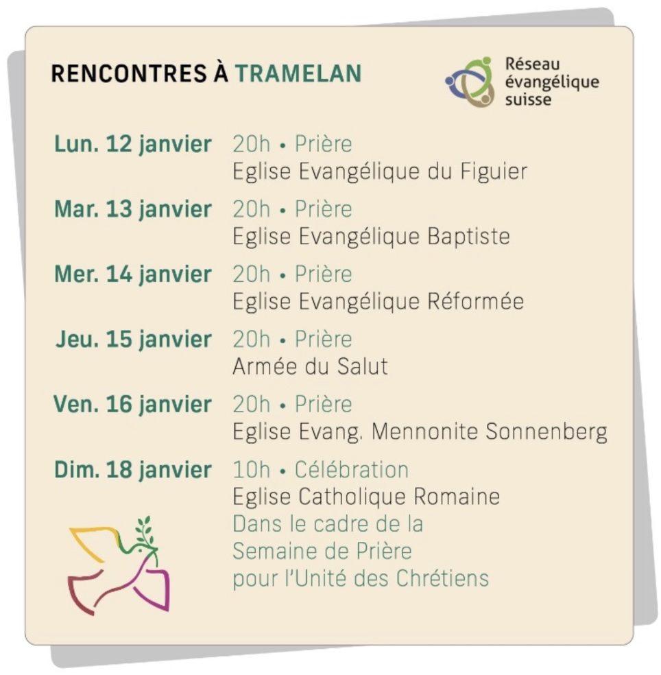 Du 11 au 18 janvier 2026, nous participons à une semaine de prière en commun avec les Eglises de Tramelan. Voici ci-dessous le programme de la semaine. Dimanche matin, pas de culte à l’Oratoire. Le culte en commun se fait à l’église catholique de Tramelan à 10h.