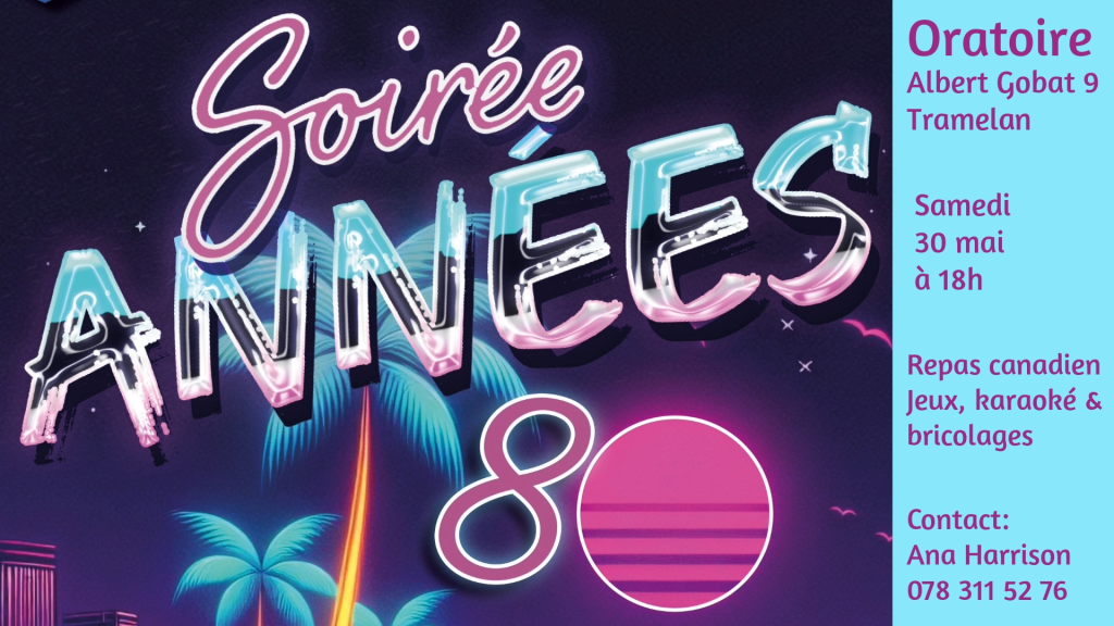 Une soirée conviviale le samedi 30 mai à 18h sur le thème des années 80: repas canadien, jeux, Karaoké et bricolages pour les enfants.
